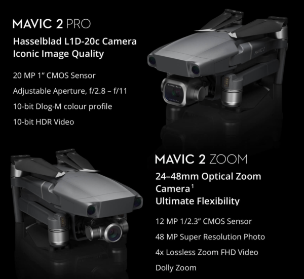 Nově se v nabídce DJI objevily další dva modely z poloprofesionální řady Mavic. Výrobce je pojmenoval jednoduše Mavic 2, přičemž každý z nich se chlubí jedinečnými schopnostmi. DJI Mavic 2 Pro se chlubí 1“ CMOS snímačem (20 Mpx) s optikou od Hasselblad. Již tento punc dává jasně najevo, že fotografie i video nabídnou nečekaně výbornou kvalitu, která v dané kategorii nemá konkurenci. Objektiv disponuje světelností v rozsahu od f/2.8 do f/11, snímač je dále vybaven podporou pro HDR a 10-bitovým Dlog-M profilem pro záznam obrazu s vysokým dynamickým rozsahem.