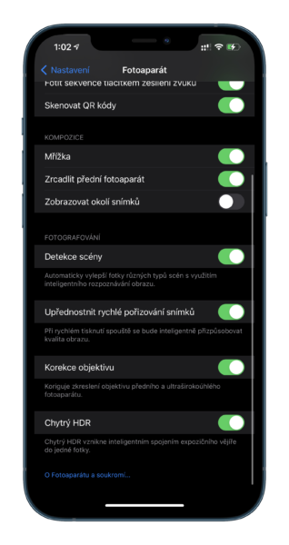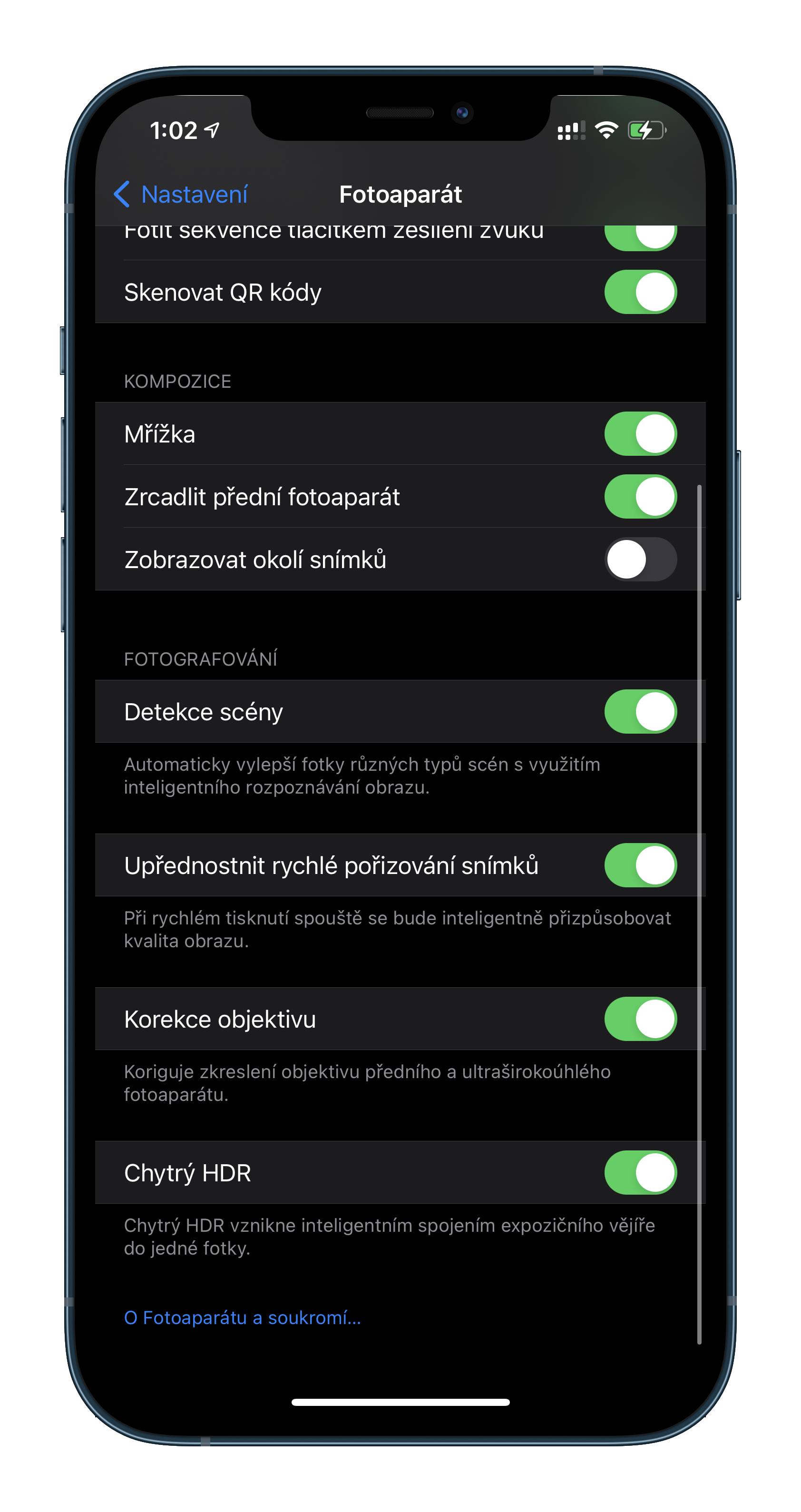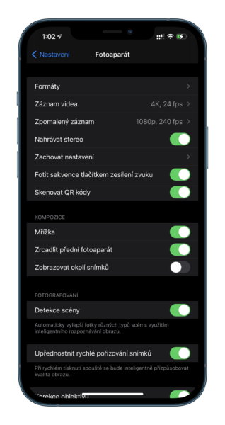 Pokud budete chtít měnit jakékoli nastavení fotoaparátu, vše pohromadě naleznete v Nastavení > Fotoaparát. Pro inspiraci přidávám screenshoty mého nastavení.