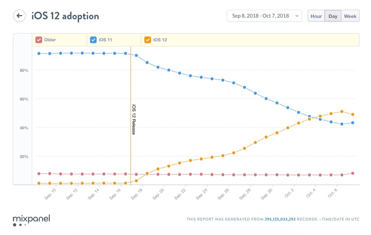 Napovídá tomu fakt, že během prvních 20 dnů od spuštění nejnovějšího iOS 12 si jej do svých telefonů a tabletů nainstalovalo 50 procent všech uživatelů. Vyplývá to ze statistik zahraniční společnosti mixpanel.com, která ke svému výzkumu používá data sesbíraná kombinací přístupu k webovým stránkám a mobilním aplikacím. Pro srovnání, iOS 11 dosáhl stejného počtu uživatelů za více než měsíc.