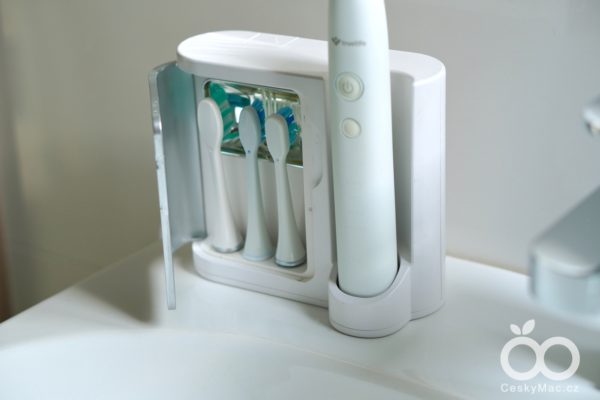 U dokovací stanice se ovšem na chvíli zastavím. Kromě nabíjecí části disponuje malým boxem, kam lze umístit tři hlavice. Ten navíc funguje jako UV sterilizátor, který dokáže během pár minut zničit až 99,9 % všech bakterií na hlavici kartáčku.