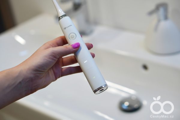Na těle kartáčku se nachází pouze dvě tlačítka – jedno slouží pro zapnutí/vypnutí a druhé pro výběr režimu. V dolní polovině se pak nachází indikátor baterie a podsvícené popisky čistících režimů.