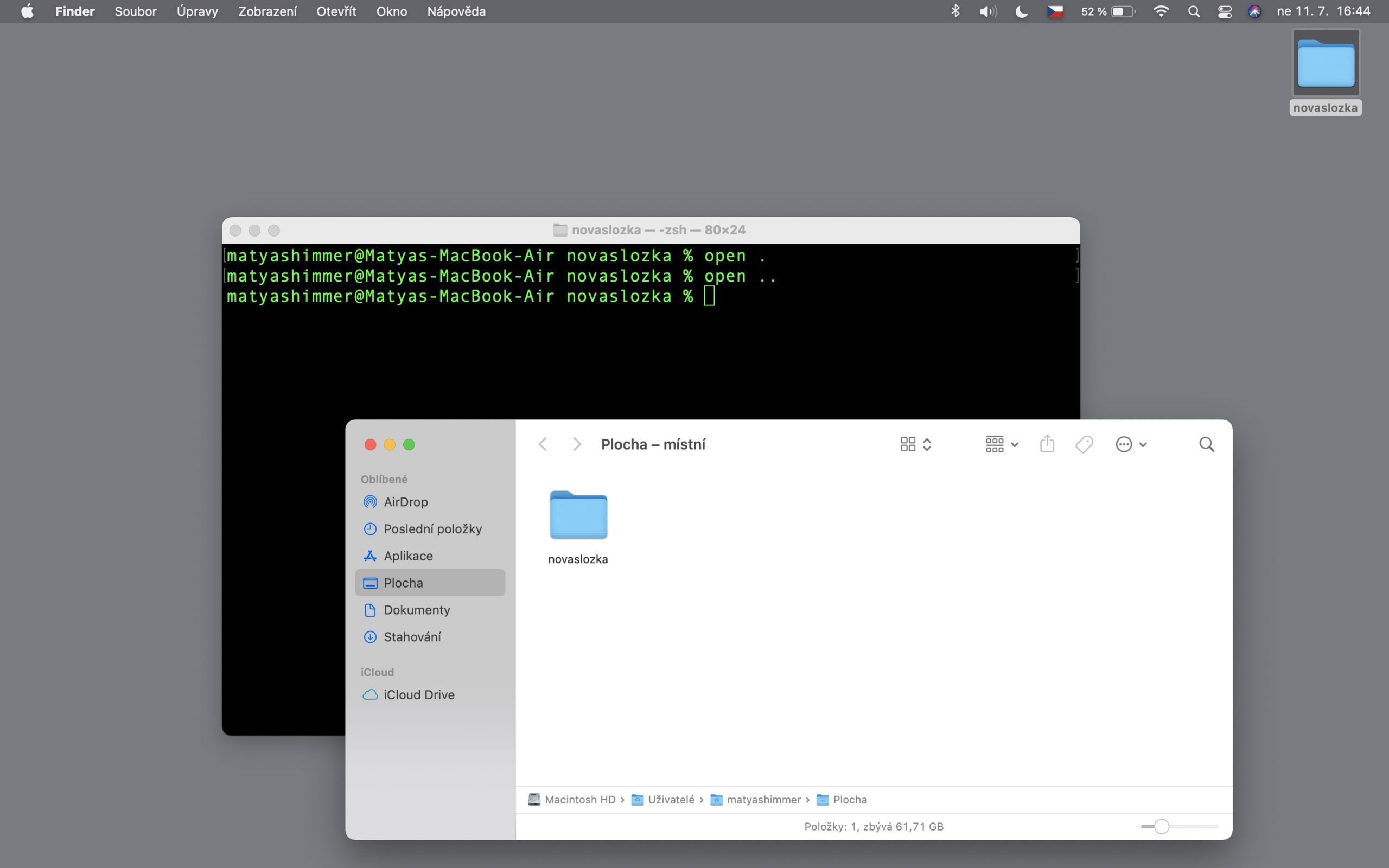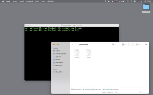 Další šikovný příkaz je open, který nám složku, ve které se právě nacházíme, otevře v novém okně Finderu. Stačí napsat open . pro otevření aktuální složky, nebo open .. pro otevření nadřazené složky.