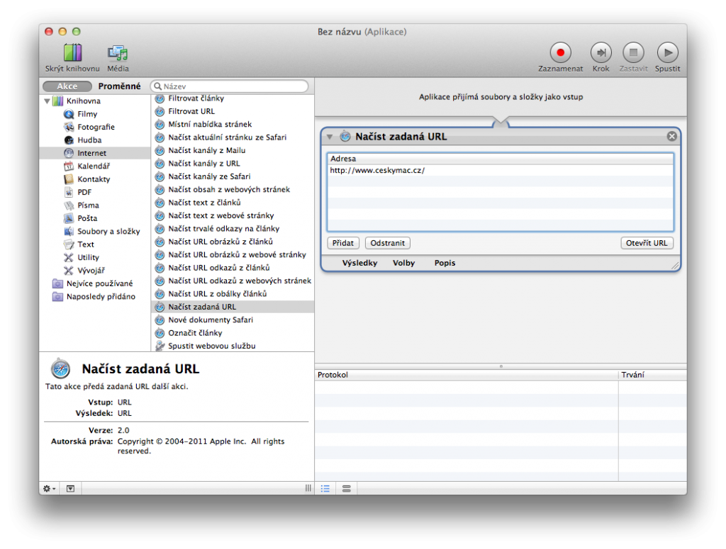 - V levém menu vybereme Internet a z nabídky Načíst zadaná URL a přetáhněte ji do okna kde je napsáno Chcete-li sestavit… Druhou možností je přetáhnout URL rovnou z prohlížeče a automator automaticky vybere položku Načíst zadaná URL.