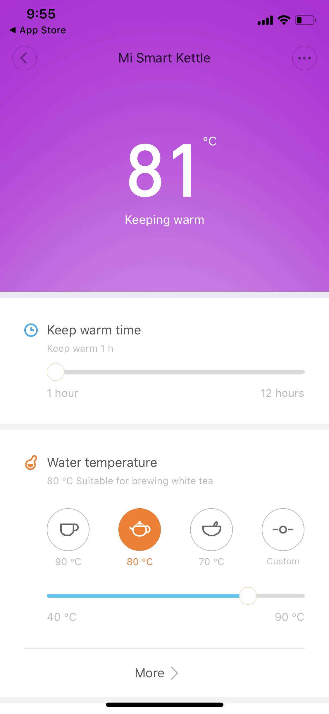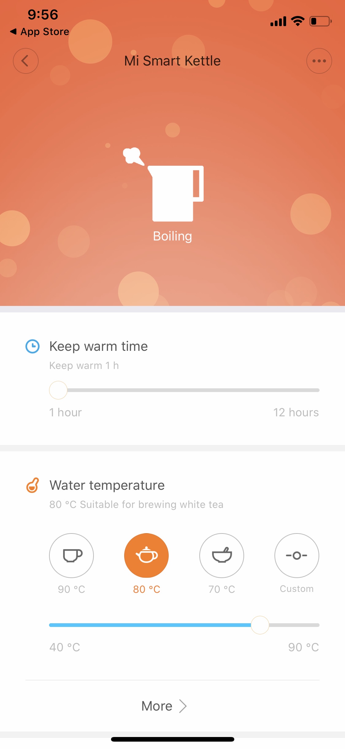 Samotné párování probíhá poměrně snadno a asi není nutné tento postup podrobněji upřesňovat. Zmíním jen, že připojení se, stejně jako u ostatních výrobků Xiaomi, provádí přes aplikaci Mi Home. Po připojení se dostanete do poměrně známého prostředí. Zde si můžete zvolit, na jakou teplotu by se voda měla ohřát, a to v rozmezí 40 až 90 stupňů. Aplikace sama napoví, že například 80 stupňů je teplota nejvhodnější pro přípravu bílého čaje a 90 stupňů se hodí pro kávu. Samotný proces vaření, nebo ohřátí ale z aplikace nezvládnete. Musí se totiž spustit na konvici.