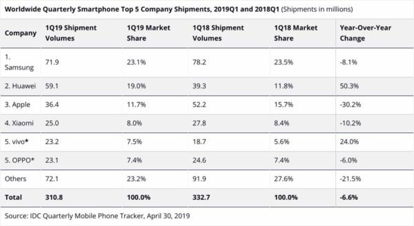Světovou jedničkou zůstává Samsung, který za uplynulé čtvrtletí prodal 71 milionů smartphonů. Také Jihokorejci ale zaznamenali ztrátu. Chytrých telefonů značky Samsung se totiž loni prodalo o 8 procent méně. Největším skokanem je potom už zmíněný Huawei, který prodeje zvýšil o 50 procent. Celkem světoví výrobci za čtvrtinu roku prodali 310 milionů smartphonů, což oproti loňsku představuje propad o 6 procent.